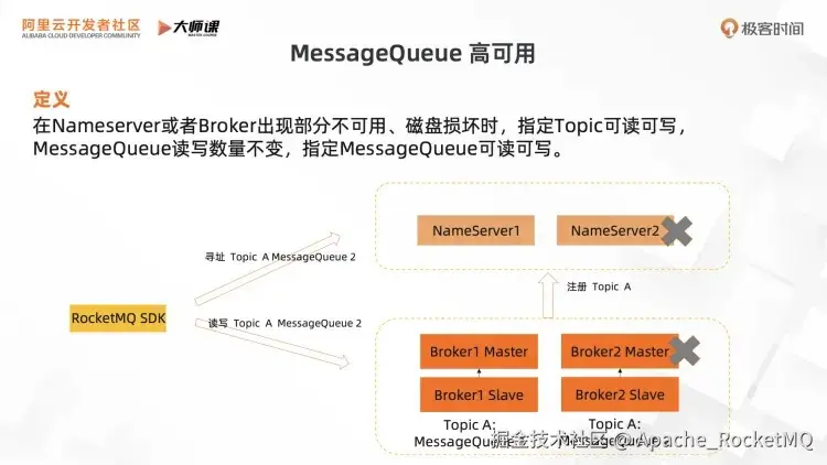上面的内容中,我们站在单机的视角,从功能的层面学习 RocketMQ 的存储引擎,包括 Commitlog 和索引。现在我们重新跳出来,再从集群视角看 RocketMQ 的高可用。我们先定义一下 RocketMQ 的高可用,指当 RocketMQ 集群出现 NameServer、Broker 局部不可用的时候,指定的 Topic 依然是可读可写的。