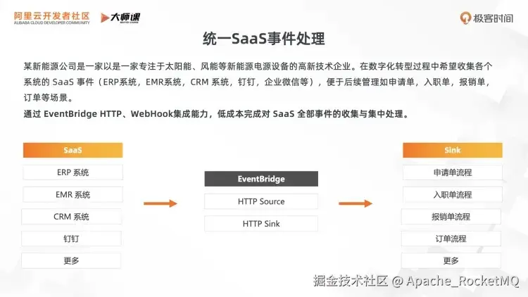 第二个案例是 SaaS 事件的集成。现在随着整个云计算生态的繁荣,有不少企业不仅使用了公共云的 IaaS、PaaS 产品,也会同时使用三方的 SaaS 产品,比如各种 ERP、CRM 等系统。基于 EventBridge 标准的 HTTP、webhook 的集成能力,能够无缝连接三方 SaaS 系统作为事件源,企业能够收集到他所关心的所有 SaaS 事件,方便后续管理,比如申请单,入职单,报销单,订单等等这些场景。
