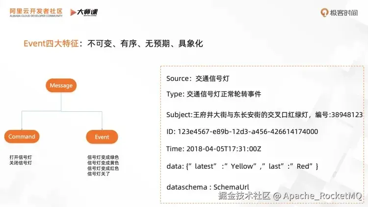 对于 Event 来说,有四个主要的特征: 第一,它是一个不可变的,事件就是表示已经发生了的事情,已经成为事实。 第二,事件有时间概念,并且对同一个实体来说事件的发送是有序的。如信号灯按顺序发送了绿、黄、红等事件。 第三,事件是无预期的,这个就是EDA架构之所以能够实现最大化解耦的特点,事件的产生者对于谁是事件消费者,怎么消费这个事件是不关心的。 第四,由于事件驱动是彻底解耦的,并且对于下游怎么去消费事件没有预期,所以事件是具象化的,应该包括尽可能详尽的信息,让下游消费者各取所需。比如像交通交通信号灯事件,包含多个字段,包括它的来源是谁、它的类型是什么?它的主题是什么?是具体的哪一个信号灯,另外它会包含唯一的ID,便于跟踪?它会有事件发生时间,事件的内容。