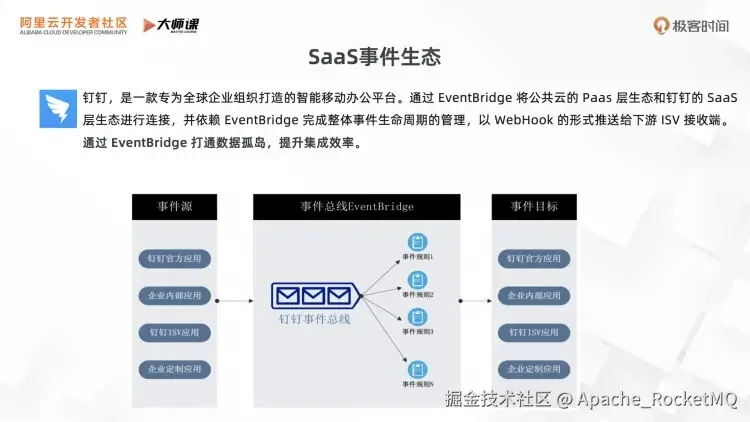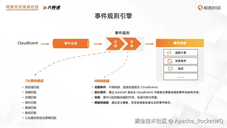 它的核心技术都是基于 RocketMQ,但是在产品界面上面向事件驱动的业务进行一层抽象,核心领域对象从消息变成 CloudEvents。基于统一事件标准来构建事件驱动的数字生态。它的事件源也很多样,可以是云产品事件,可以是 SaaS 平台事件,应用自定义事件、通用的 WebHook。当然,它的事件目标更是多样化的,通过事件规则引擎把事件路由到不同的消费者,典型的消费者,比如函数计算,也可以是存储系统,消息通知如钉钉短信,还有通用的的 webhook。通过事件驱动这种彻底解耦的架构,更适合建设混合云、多云的数字化系统。