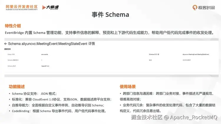 为了提升事件驱动的研发效率,EventBridge 也支持 Schema 的特性,支持事件信息的解释、预览,甚至还可以自动化的生成代码,让开发者以低代码、0 代码的方式完成事件集成。