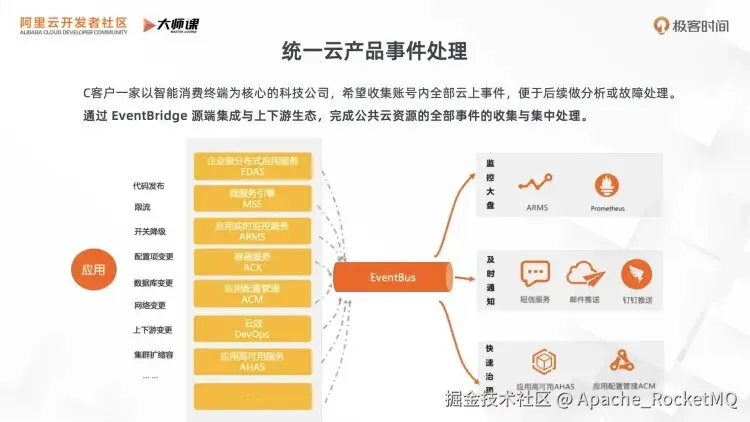 第一个案例适用于使用大量云产品的公司。C 客户是一家以智能消费终端为核心的科技公司,希望收集账号里全部的云上事件,方便后续做分析或故障处理。公共云的 EventBridge 汇聚了所有的云产品事件,通过 EventBridge,客户能收集全量的事件对齐进行自定义的业务处理。还能够配置事件规则,过滤异常事件推送给监控系统或者钉钉,及时关注处理。