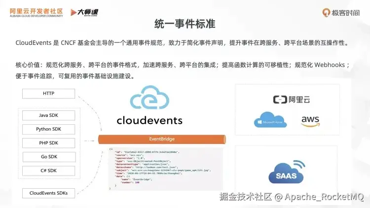在云计算的时代、大规模数字化转型时代,我们强调事件驱动架构往往跨越了不同的组织,不同的平台。所以事件驱动架构需要一个统一的事件标准。在 EventBridge 这个产品里,我们采纳了 CNCF 基金会中的 CloudEvents 标准,这个是业界事件的事实标准,这个标准就是为了简化事件声明,提升事件在跨服务、跨平台的互操作性。