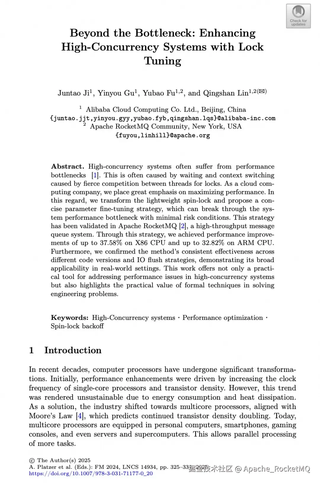 (1)2024 年 9 月,由阿里云消息队列团队发表的关于 RocketMQ 锁性能优化论文《Beyond the Bottleneck: Enhancing High-Concurrency Systems with Lock Tuning》被 CCF-A 类软件工程顶级会议 FM 2024 录用。