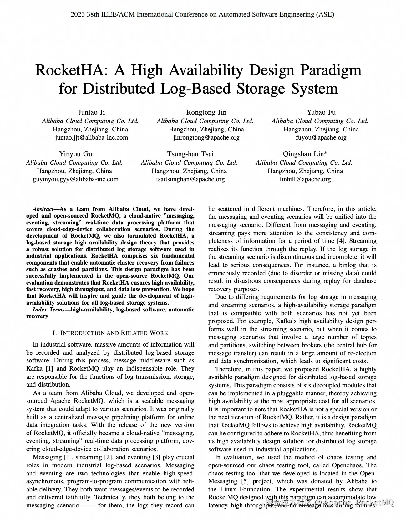 (2)2023 年 9 月,由阿里云消息队列团队发表的关于 RocketMQ 高可用范式设计论文《RocketHA: A Log-based Storage High Availability Paradigm for Messaging and Streaming Scenarios》被软件工程 CCF-A 类顶级会议 ASE 2023 录用。