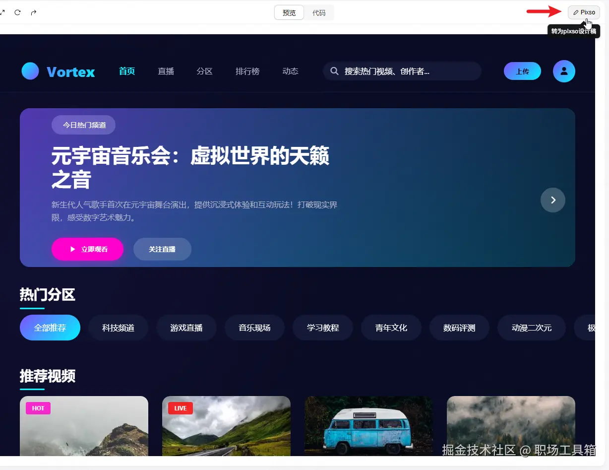 点击AI文生设计稿右上角的“转为pixso设计稿”,就可以将这张AI生成的设计稿,一键转换为标准的Pixso设计文件。基于Pixso提供的在线编辑器,你可以对AI生成的设计方案进行编辑和“二创”。