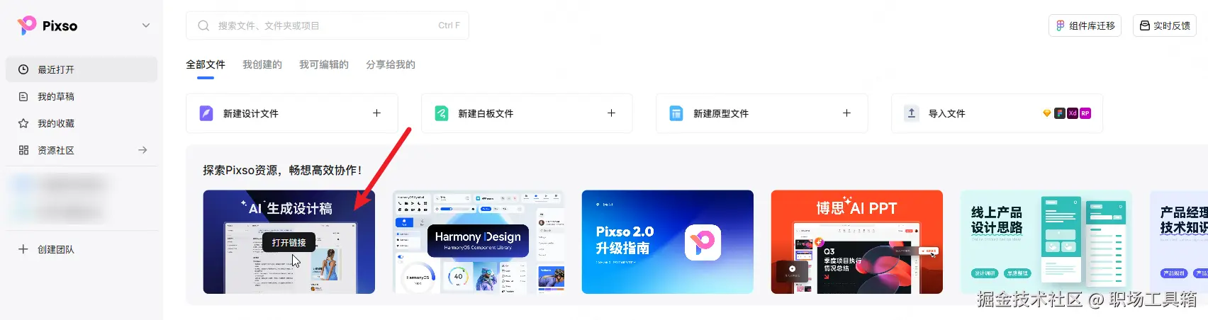 使用浏览器打开Pixso首页,在Pixso工作台界面,如下图,可以轻松找到“AI 生成设计稿”的入口。点击后会打开一个新的标签页,即为AI文生设计稿的界面。