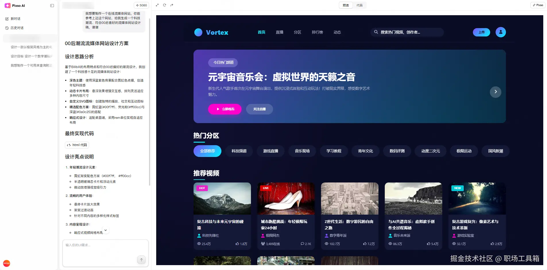 这种“一句话生成UI”的能力,打破了传统设计流程中“想法”与“图形”之间的壁垒,让创意的表达变得更直接高效。抽象的概念在几秒钟内就能转化为可供评审和迭代的视觉方案,最大限度压缩了产品设计各个环节的时间。