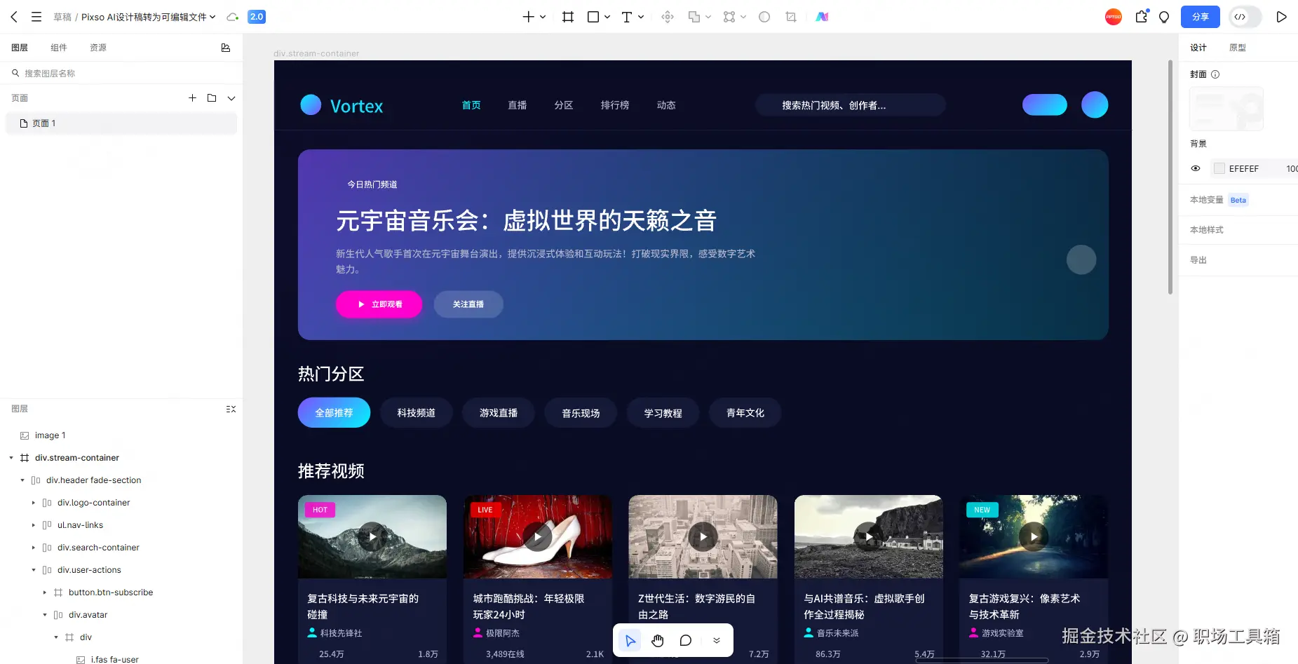 Pixo的AI文生设计稿功能,其价值远不止于快速生成视觉方案。更重要的是,它与Pixso强大的在线设计编辑器实现了无缝衔接。当AI生成的设计稿呈现在你面前时,它并非一张静态的图片,而是一个包含了完整图层、样式信息的设计文件。