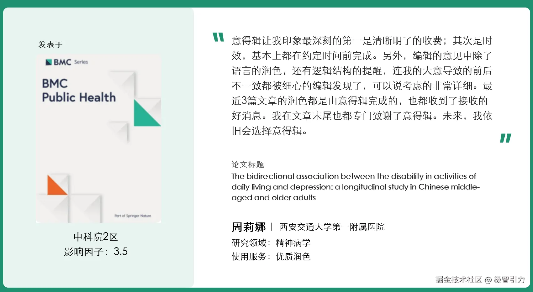 “编辑的意见中除了语言的润色,还有逻辑结构的提醒,连我的大意导致的前后不一致都被细心的编辑发现了,可以说考虑的非常详细。最近3篇文章的润色都是由意得辑完成的,也都收到了接收的好消息。”