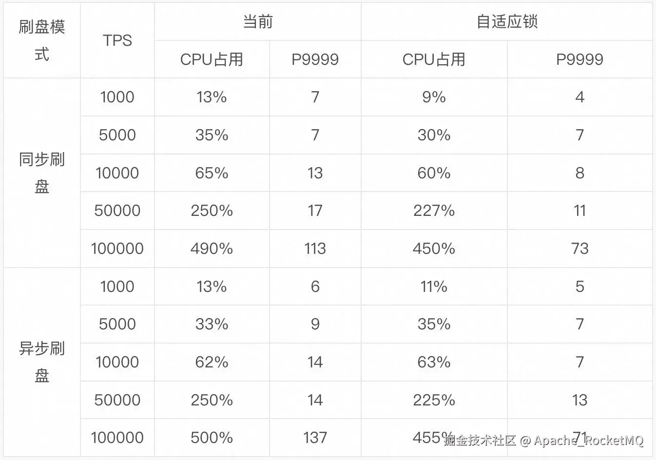 由于自旋锁在临界区较小时的响应时间(RT)以及 CPU 利用方面都有较好的表现,唯一的不足是在资源争抢时会带来资源浪费。因此我们决定对自旋锁进行优化,降低无效的资源损耗,从而更好的利用自旋锁的优点,使其同时适合争抢激烈或不激烈的场景。在实践中,我们已经证明了调整锁策略会影响 RocketMQ 的消息发送性能,带来显著的性能优化结果。