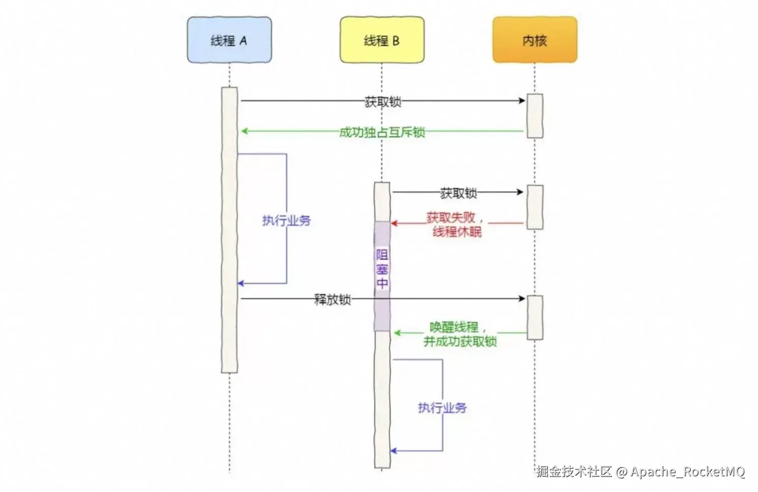互斥锁加锁失败而阻塞是由操作系统内核实现的,当加锁失败后,内核将线程置为睡眠状态,等到锁被释放后,内核会在合适的时机唤醒线程,当这个线程加锁成功后就可以继续执行。具体的互斥锁行为可以参考下图: