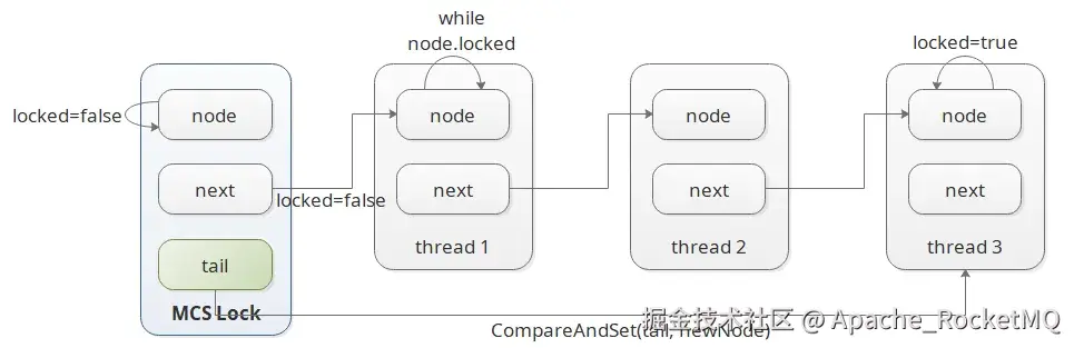 与 CLH 相似,但是时在本地自旋,更改下一个节点的状态。解决了 CLH 在 NUMA 系统架构中获取 locked 域状态内存过远的问题