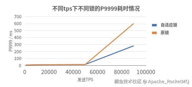 可以看到,在不同 TPS 下,我们的自适应锁都能带来更优质的 P9999,有效降低了发送过程中由于锁争抢带来的耗时。