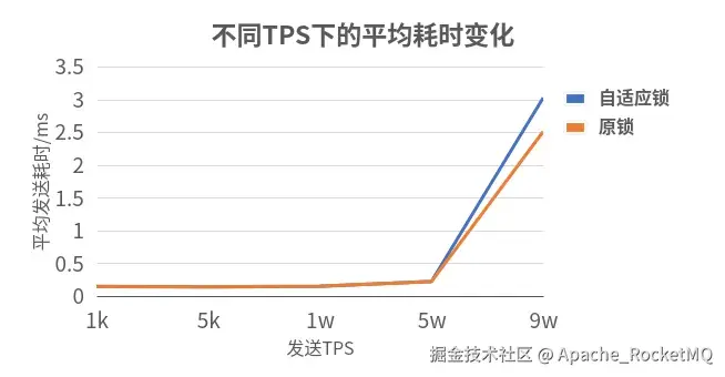 不过,尾部的请求情况一般代表竞争极为激烈时的极端场景。可能有的消息经过多次锁请求尝试但是都未获得锁,因此导致了这种长尾效应。我们还测试了在不同 TPS 下的平均发送耗时情况,发现在竞争极为严重时,我们的 ABS 锁由于自带了一定自旋,所以会让平均延时大约提升 0.5 ms。使用时需要仔细衡量具体场景,以确定是否在高压时开启自适应锁。