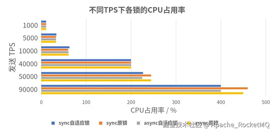 结果表明,在消息量不断增加时,我们的自适应锁带来了非常明显的优势,有效降低了 CPU 的使用率。