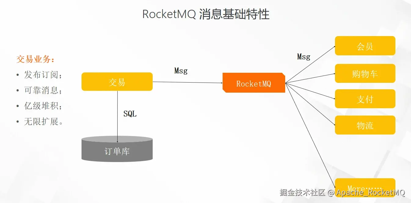 - RocketMQ基础特性:发布订阅、可靠消息、亿级堆积、无限扩展;