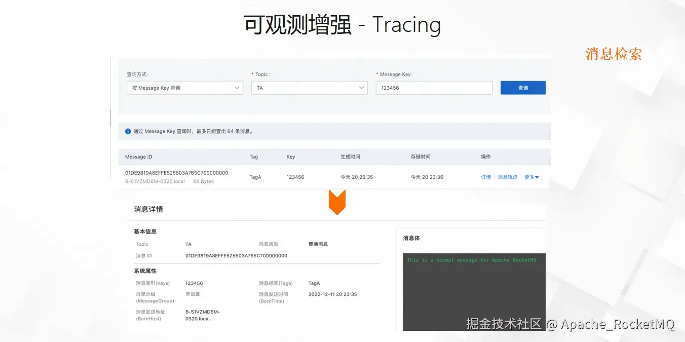 其次,RocketMQ还具备优秀的可观测能力,是稳定性的重要辅助手段。RocketMQ是业界第一个提供消息消息级别可观测能力的消息队列,每条消息都可以带上业务主键,比如在交易场景,用户可以将订单ID作为消息的业务主键。当某个订单的业务需要排查,用户可以基于订单ID查询该条消息的生成时间以及消息内容。消息的可观测数据还能继续下钻,通过消息轨迹查看消息由哪台生产者机器发送、由哪些消费者机器在什么时间消费、消费状态是成功或失败等。