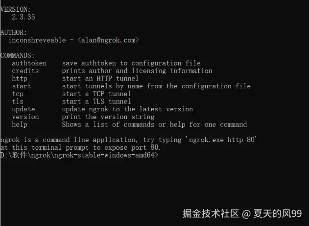 执行成功后,命令行界面中会出现下面的信息。此时,代表配置成功。ngrok程序已经在你的用户目录下,创建一个.ngrok2文件夹,并在文件夹中创建一个配置文件ngrok.yml。