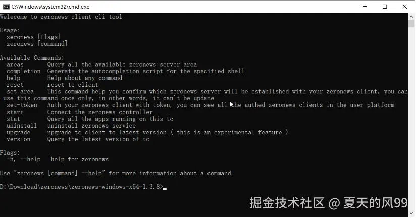 前台直接启动 ZeroNews,此方式为前端运行 ZeroNews 程序,关闭命令行窗口后,程序自动退出