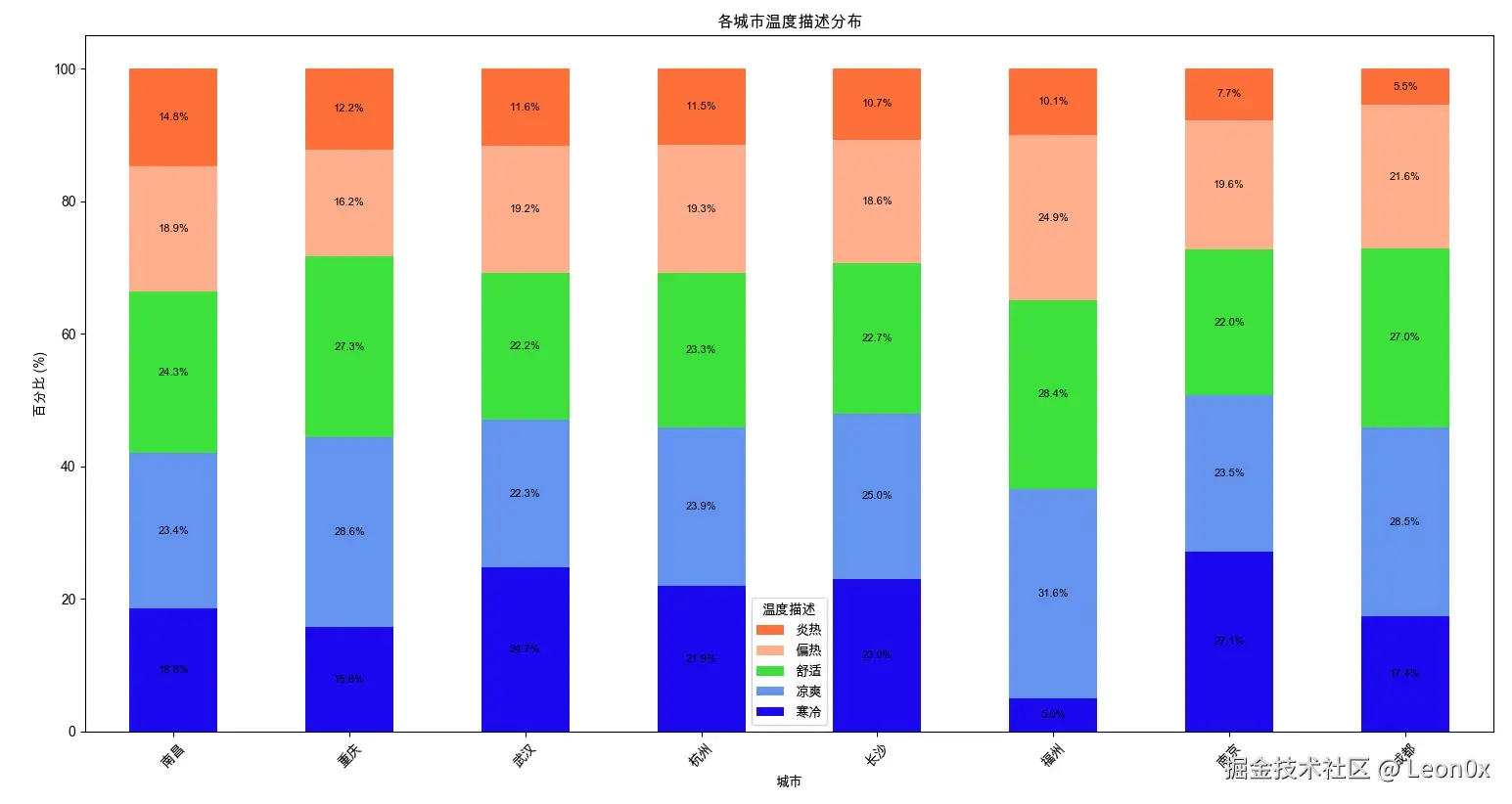 数据来源选了专业的气象平台Meteostat(相当于天气数据界的“维基百科”),抓取了2020-2024年5年的历史温度,统计了8个“候选火炉”的各温度段天数占比——简单说就是:每个城市一年里,有多少天在“烤你”。