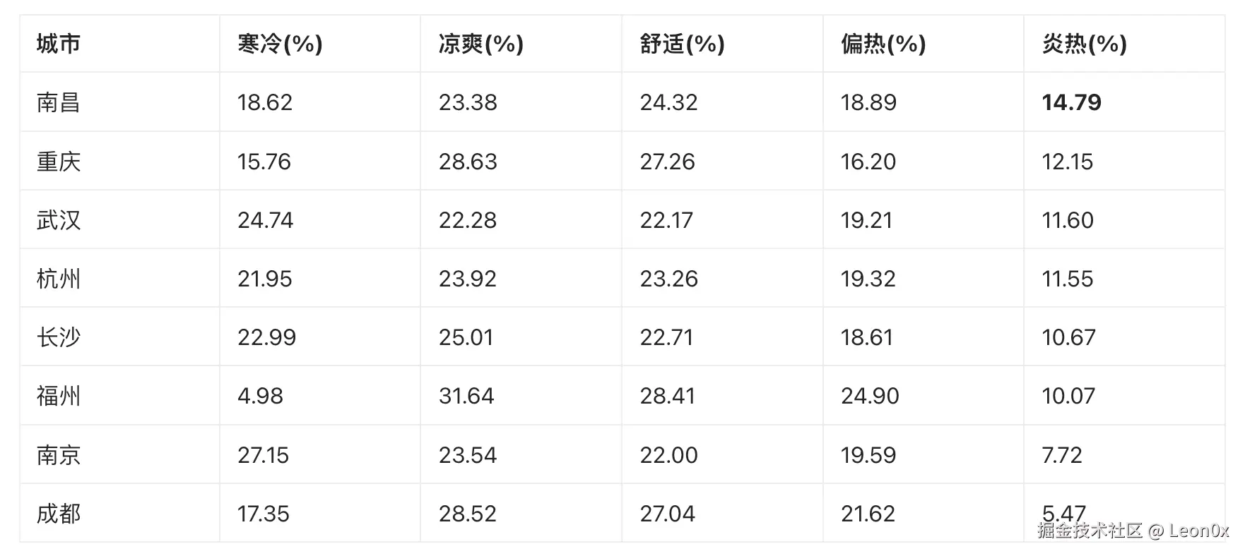 按“炎热天数占比”从高到低排序(数值越高,越“烫”),结果直接打脸我的“长沙热到融化”认知: