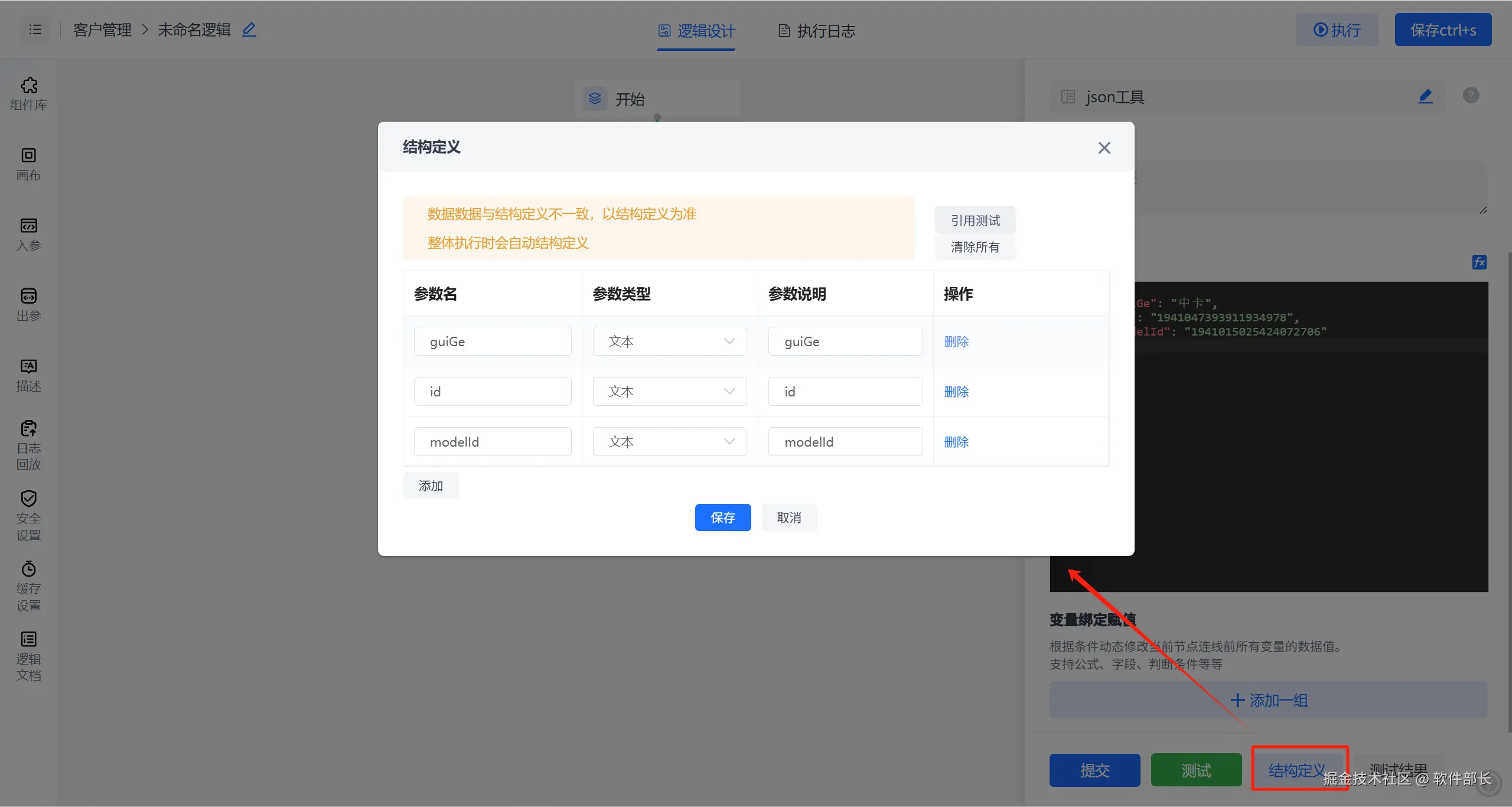然后点击【结构定义】如下图,在后续连线节点可直接引用参数