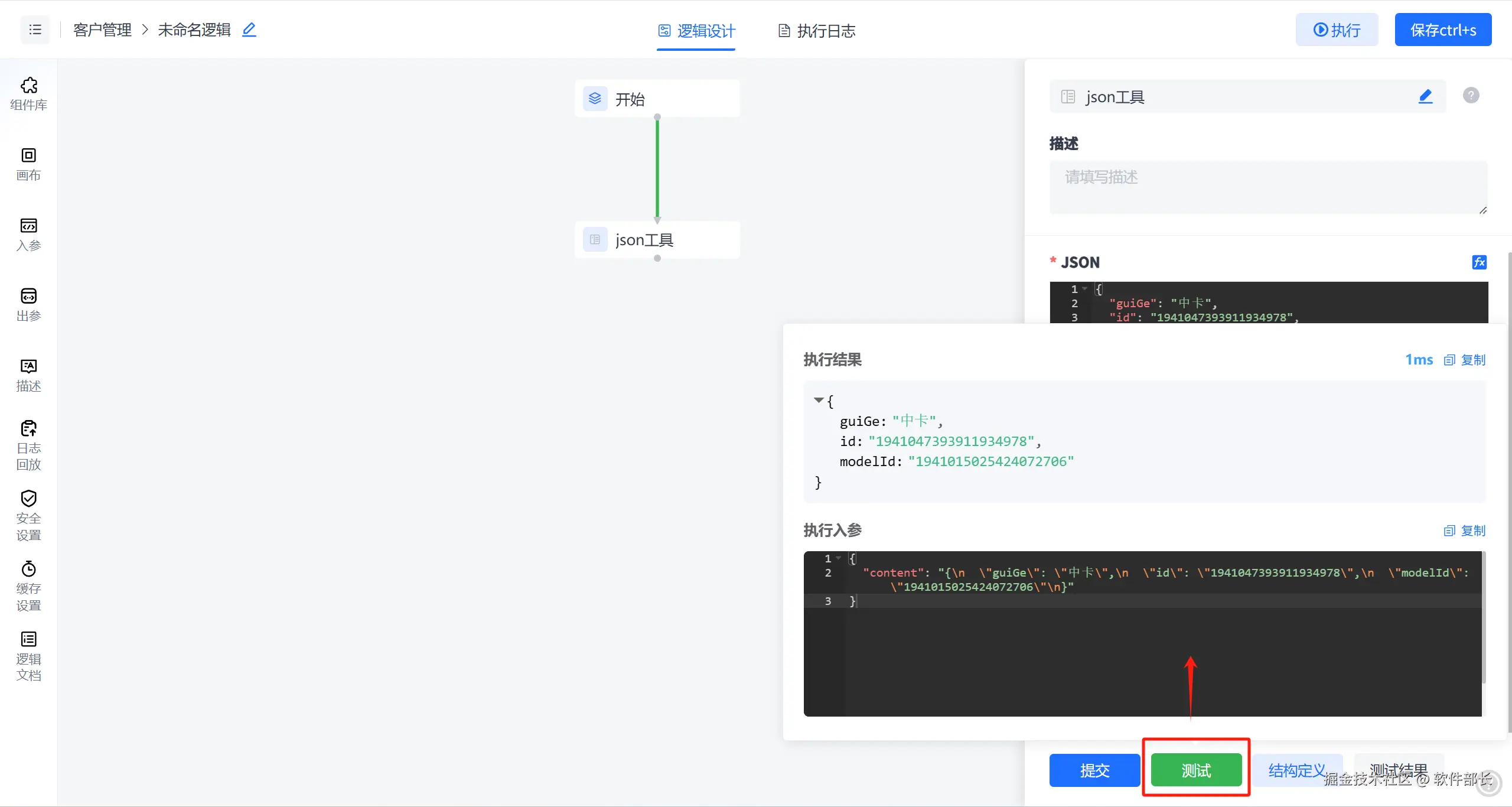 例如直接填写json对象后点击【测试】执行结果可以看到