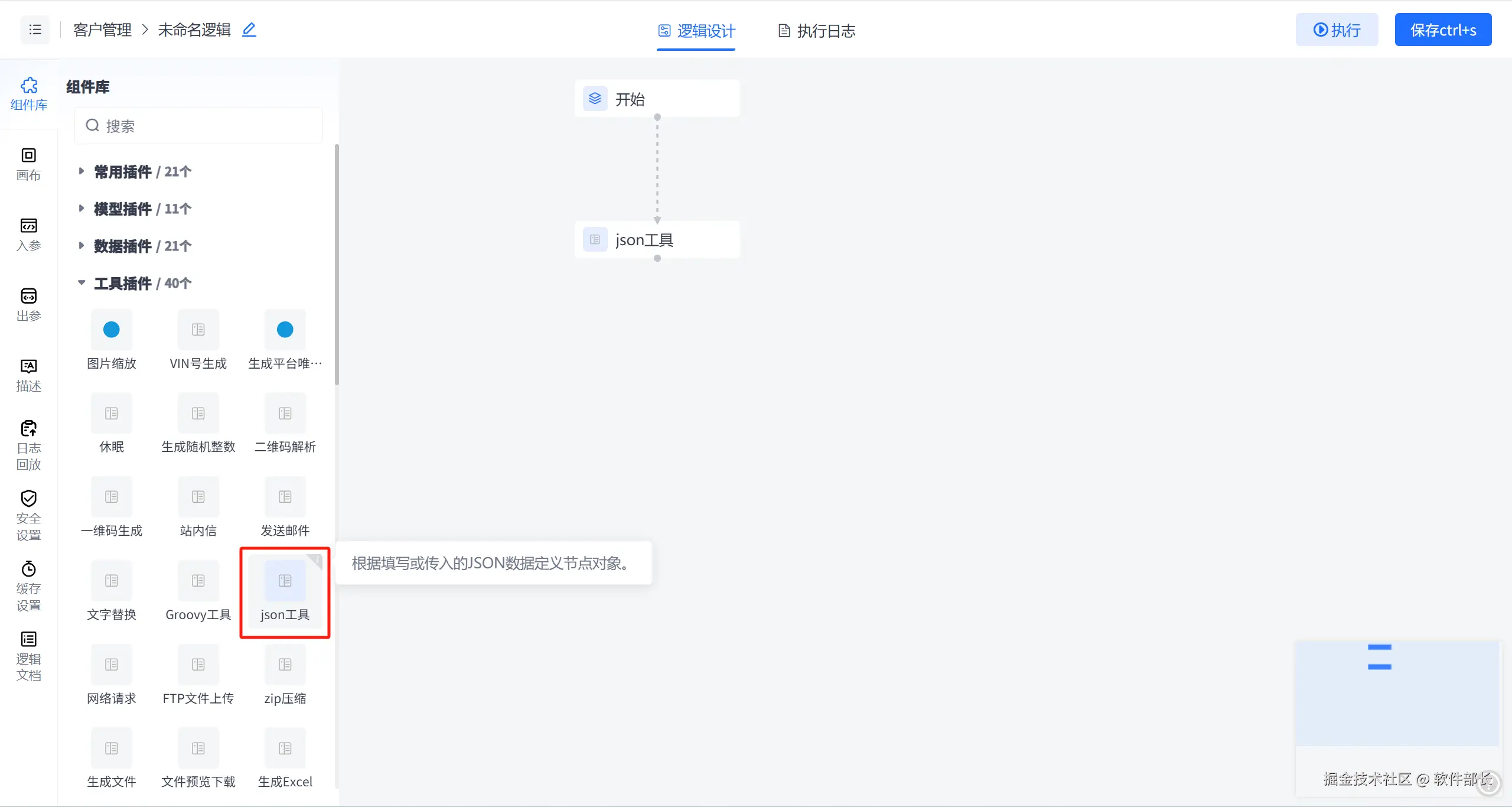 以JVS低代码为例,在JVS低代码的逻辑引擎中就提供了json工具组件,通过简单拖拽和配置就可以实现,下面我说一说 JSON 工具节点的配置方法。