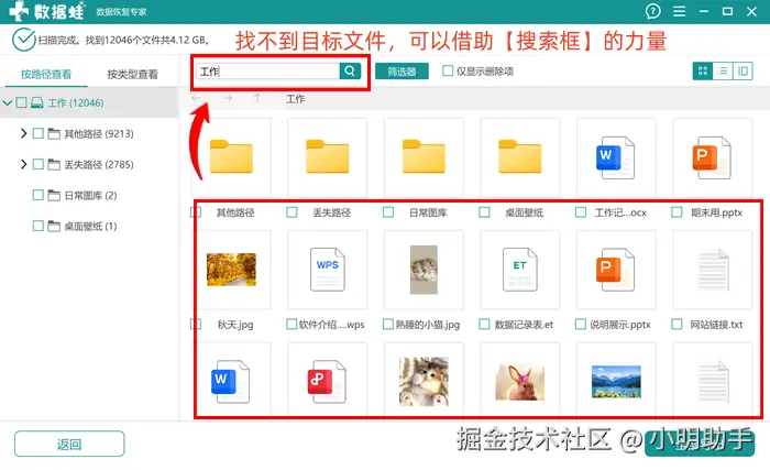 第2步: 糟糕!发现扫描出来的文件太多了,这时候我们可以点击上方的【搜索框】,在里面输入目标文件的名字后,点击右边的放大镜;