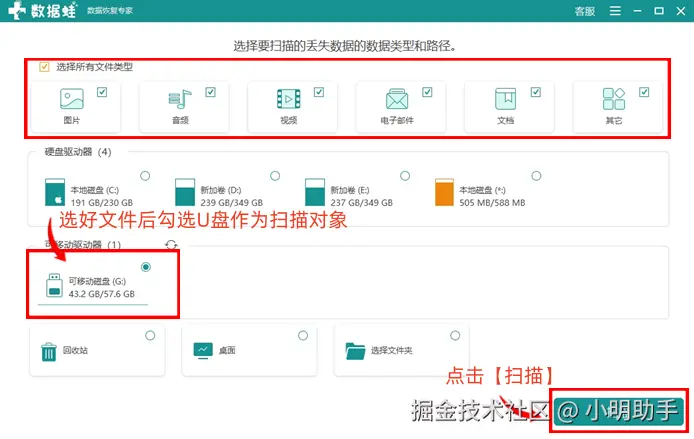 第1步: 打开软件主页面后,按照提示在上方选择好需要恢复的数据类型(此处只能选择大类,如docx文档的话勾选【文档】即可),再勾选好需要扫描的U盘,点击【扫描】;