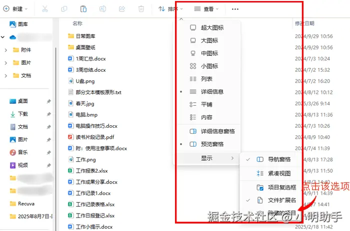 第2步: 在存储页面上点击【查看】,之后在新的列表中选择【显示】,最后在显示的列表上点击【隐藏的项目】。