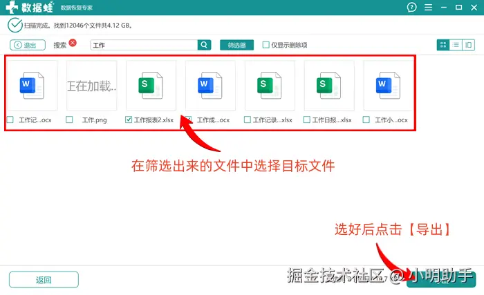第3步: 等待软件完成进一步的精准筛选后,选择需要恢复的目标文件,点击【导出】;最后在【浏览文件夹】中选好恢复好文件的存放位置即可。