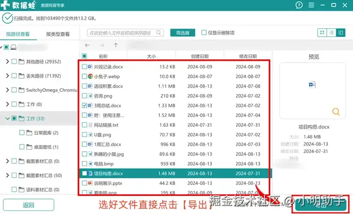 步骤2: 扫描出来的文件将在中间位置显示出来,我们可以根据文件的信息确认内容,选中需要恢复的文件后,点击【导出】;
