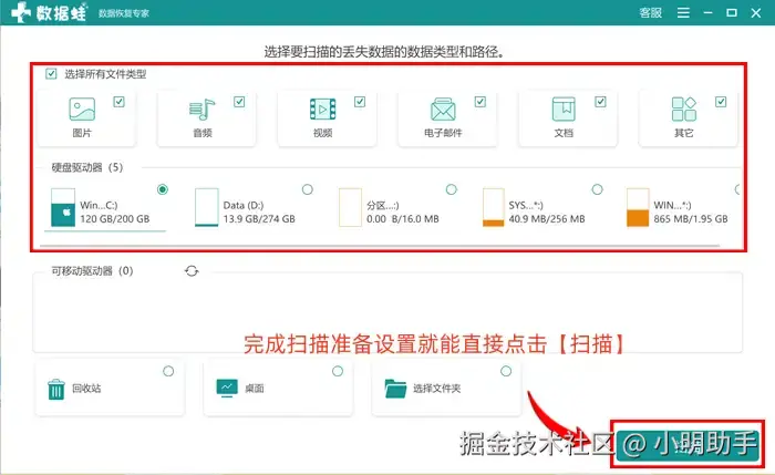 步骤1: 在软件的首页上,选择自己恢复数据的类型,然后选择需要进行扫描的位置,点击【扫描】;