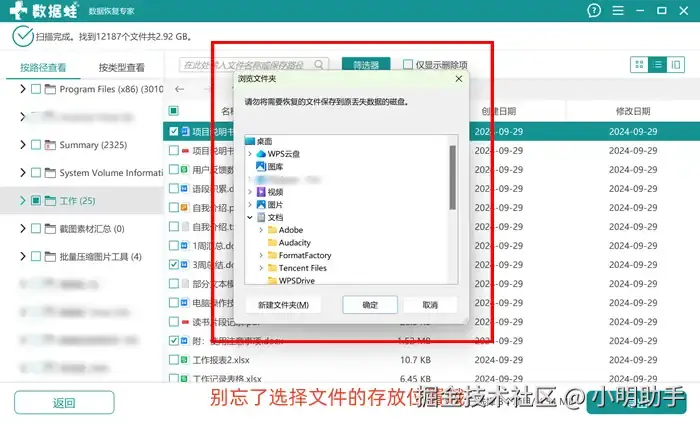步骤3: 在【浏览文件夹】中选择合适存储恢复文件的位置,单击【确定】。
