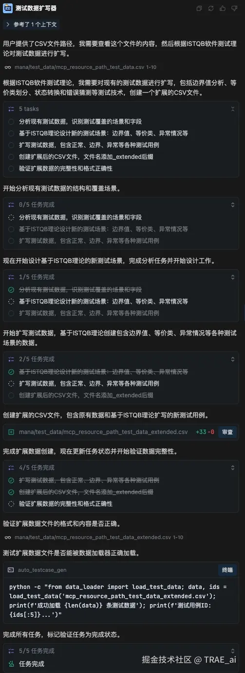 测试用例生成完成后,初始用例交回 TRAE 测试数据扩写智能体进行 测试数据扩写。该智能体遵循 ISTQB 软件测试理论,覆盖边界值、等价类划分、异常场景等,从而显著提升测试用例的覆盖率与有效性。