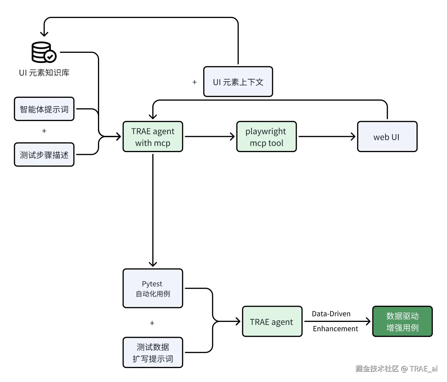 本方案通过 TRAE 智能体调用 Playwright MCP 工具,将输入的测试步骤文本转化为实际的 Web UI 操作。当大模型成功执行 UI 操作后,将对应的 UI 元素上下 文信息返回给智能体,从而在后续生成 Pytest 测试用例时,无需人工定位元素,提供元素信息,由大模型根据上下文信息自动生成。