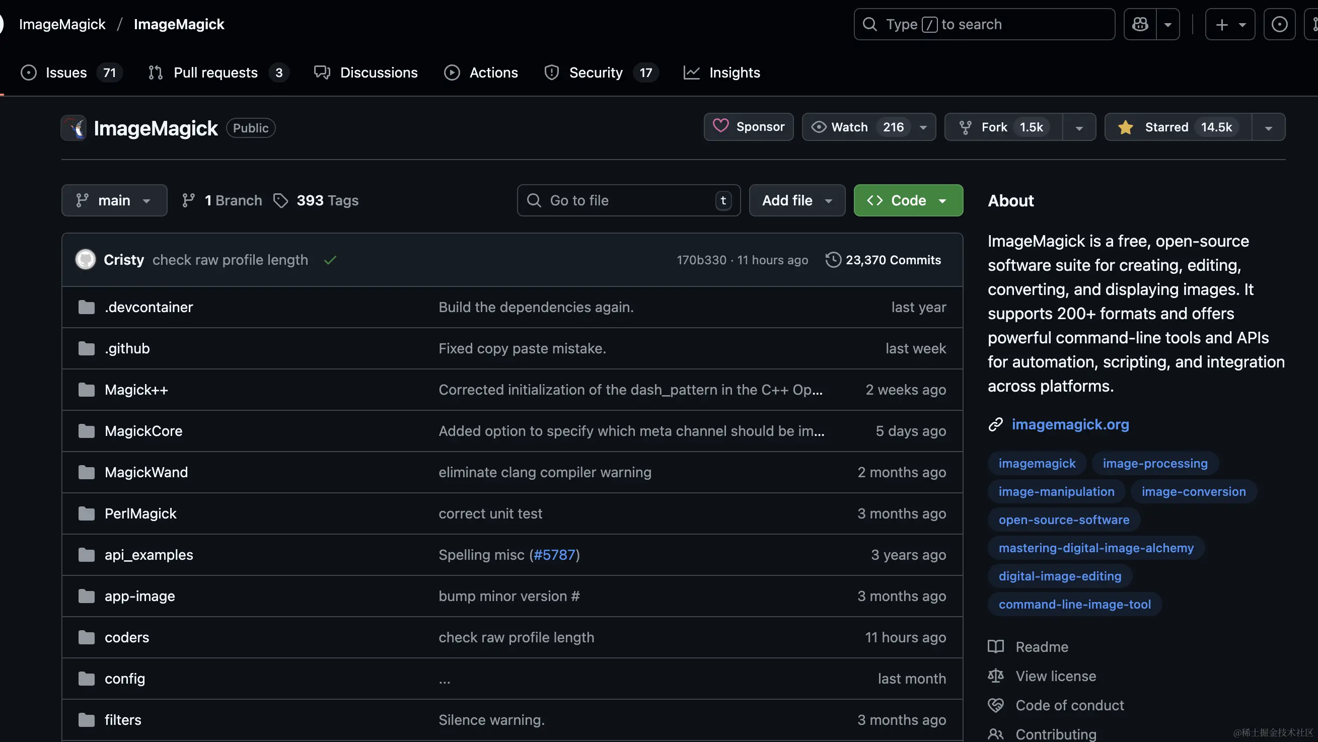 ImageMagick 是一款功能强大的开源图像处理软件套件,广泛应用于图像转换、编辑、合成和自动化处理等任务。它支持超过 200 种图像格式,包括 PNG、JPEG、GIF、WebP、HEIC、SVG、PDF、TIFF 等,开源地址:github.com/imagemagick…