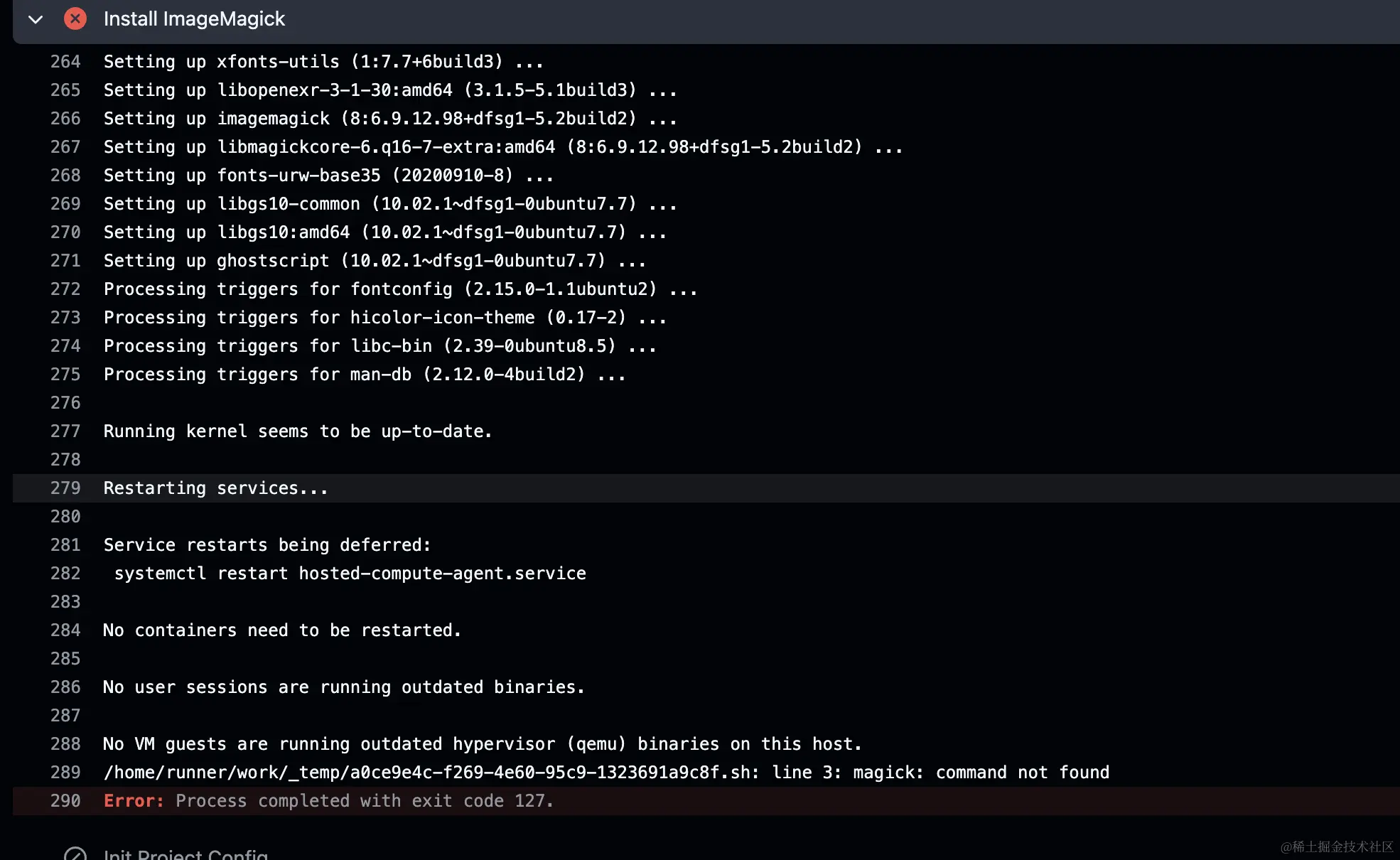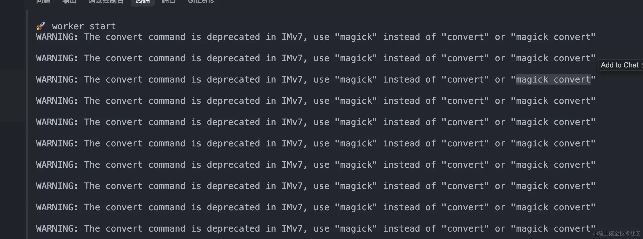 但是注意这是你的windows或者mac电脑可能会提示,这个时候你换成magick没有任何问题,但是如果你是在linux系统上运行,比如ci/cd中运行,就会报错: