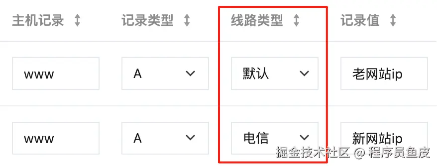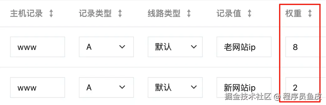 那我只需要在 DNS 解析这边动动手脚,给同一个域名配置 2 条相同类型的解析记录,一条指向新网站、一条指向老网站,再设置不同的权重,这样就通过 DNS 轮询的方式分配了流量。