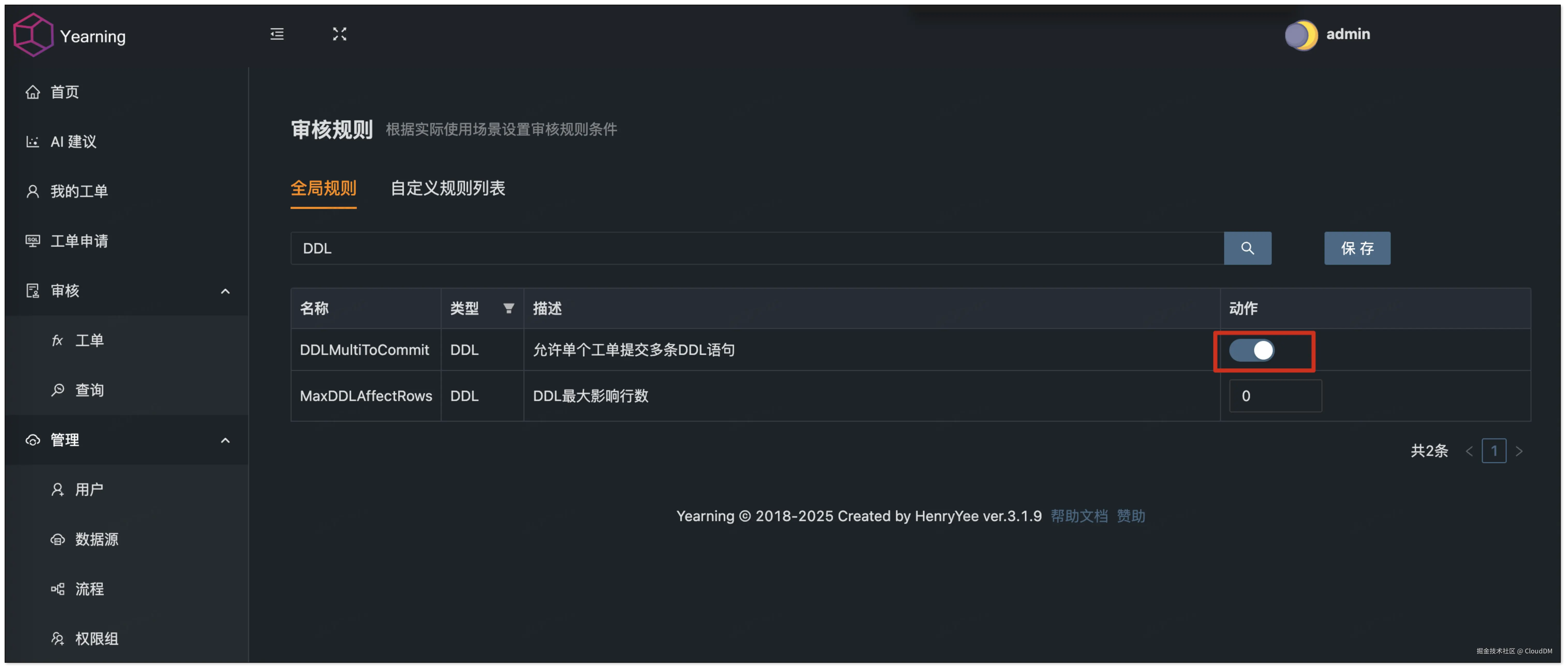 Yearning 默认限制每个 DDL 工单只能包含一条语句,需要在规则中将这个限制改为允许执行多条 DDL,否则实际使用中会比较麻烦。