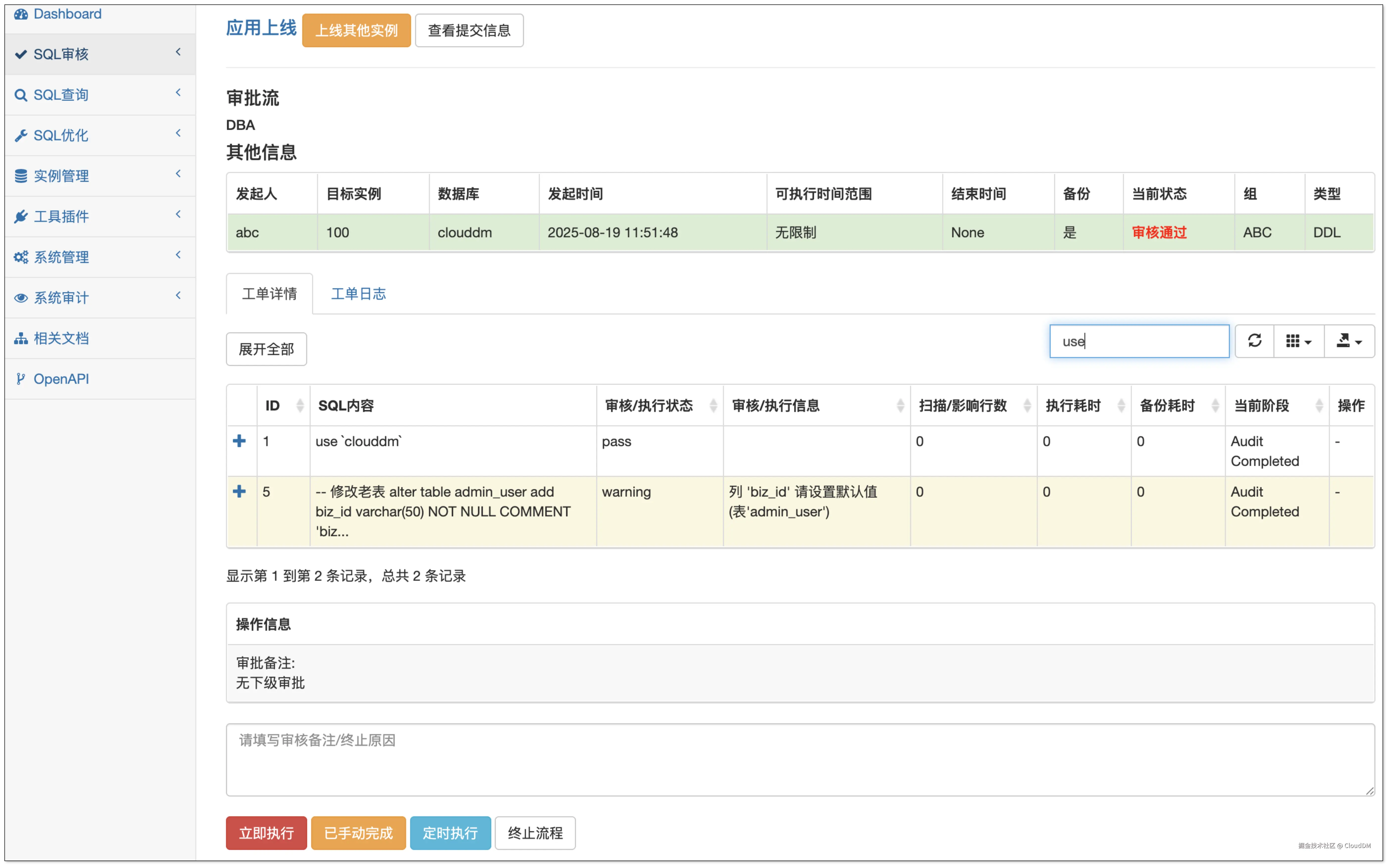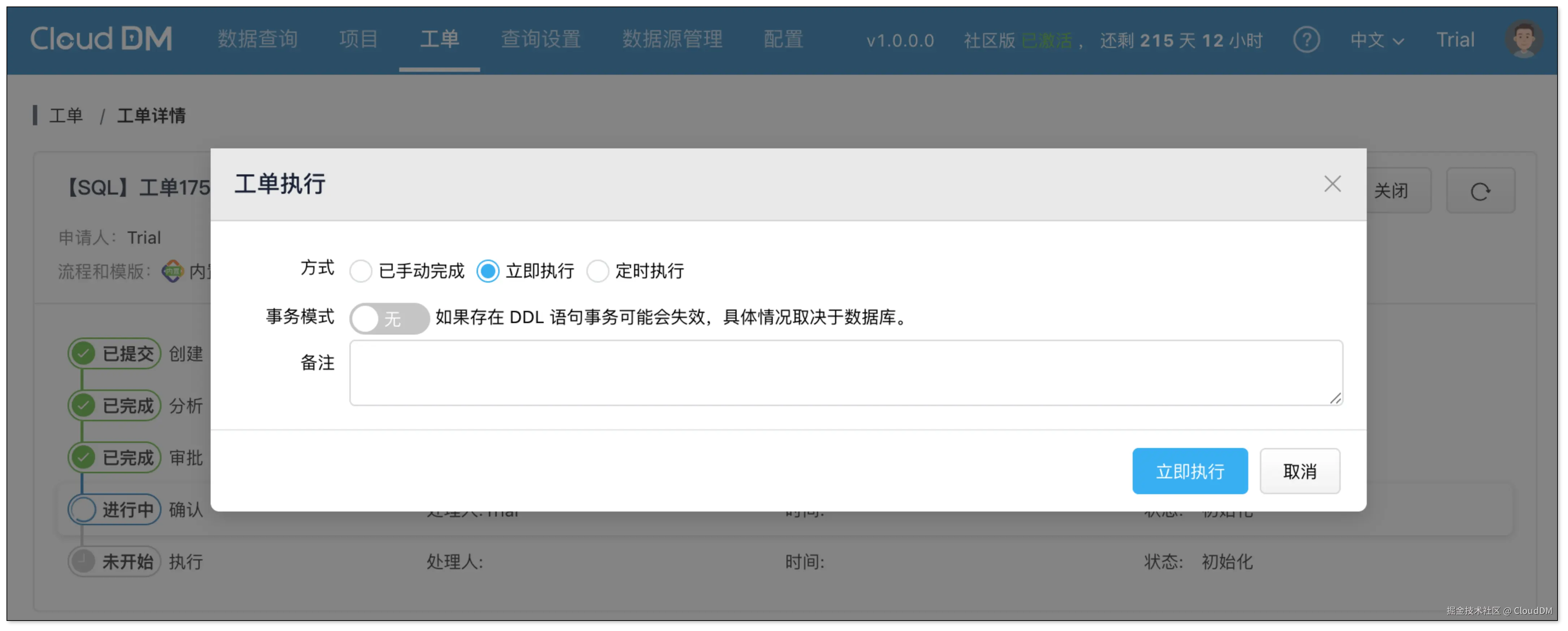 CloudDM 支持以事务方式执行工单,并提供 手动、立即、定时 三种执行模式。选择“已手动完成”意味着 DBA 可以自行处理工单,而不是完全交给系统。这在面对大型数据库或复杂 SQL 时更灵活,可以降低 DBMS 系统带来的不确定性。