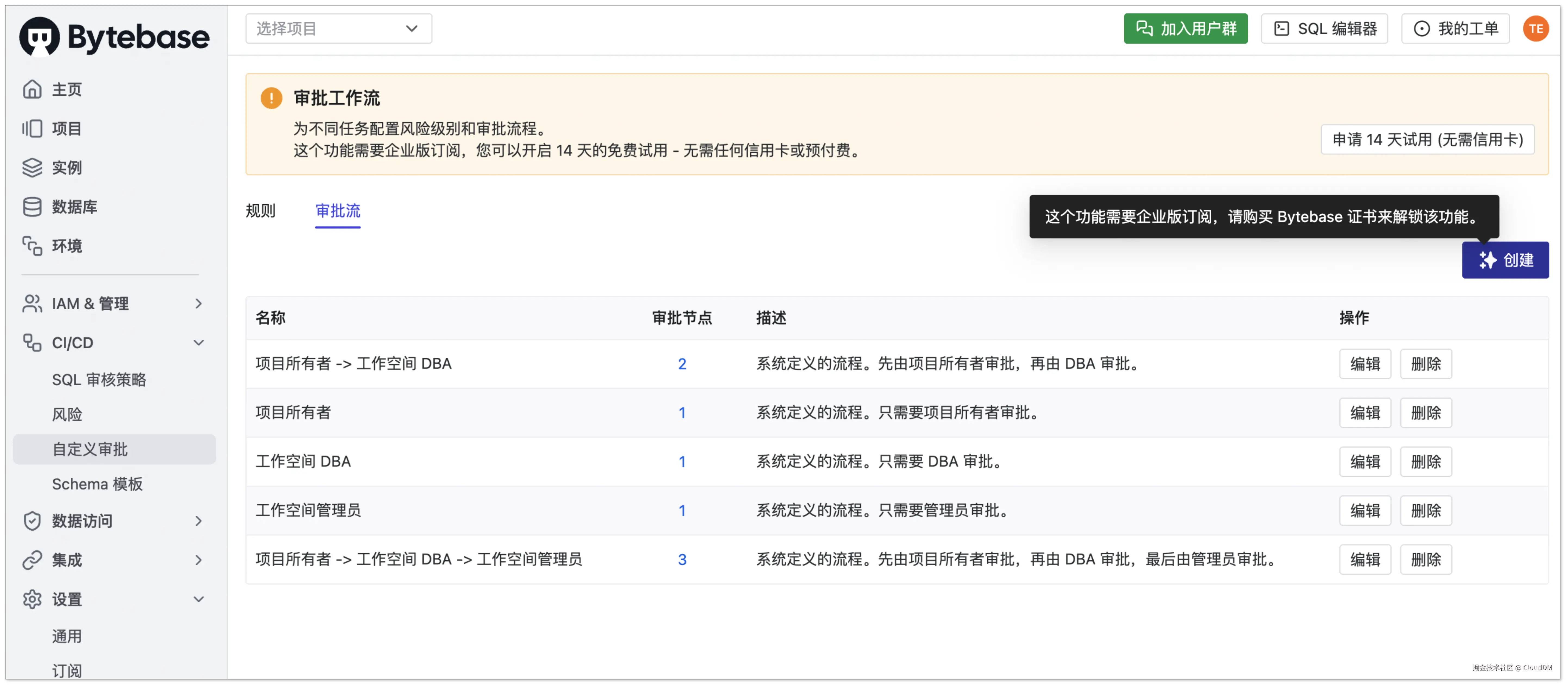- 社区版本不支持审批功能,并且产品不支持对接钉钉、飞书等外部审批引擎。