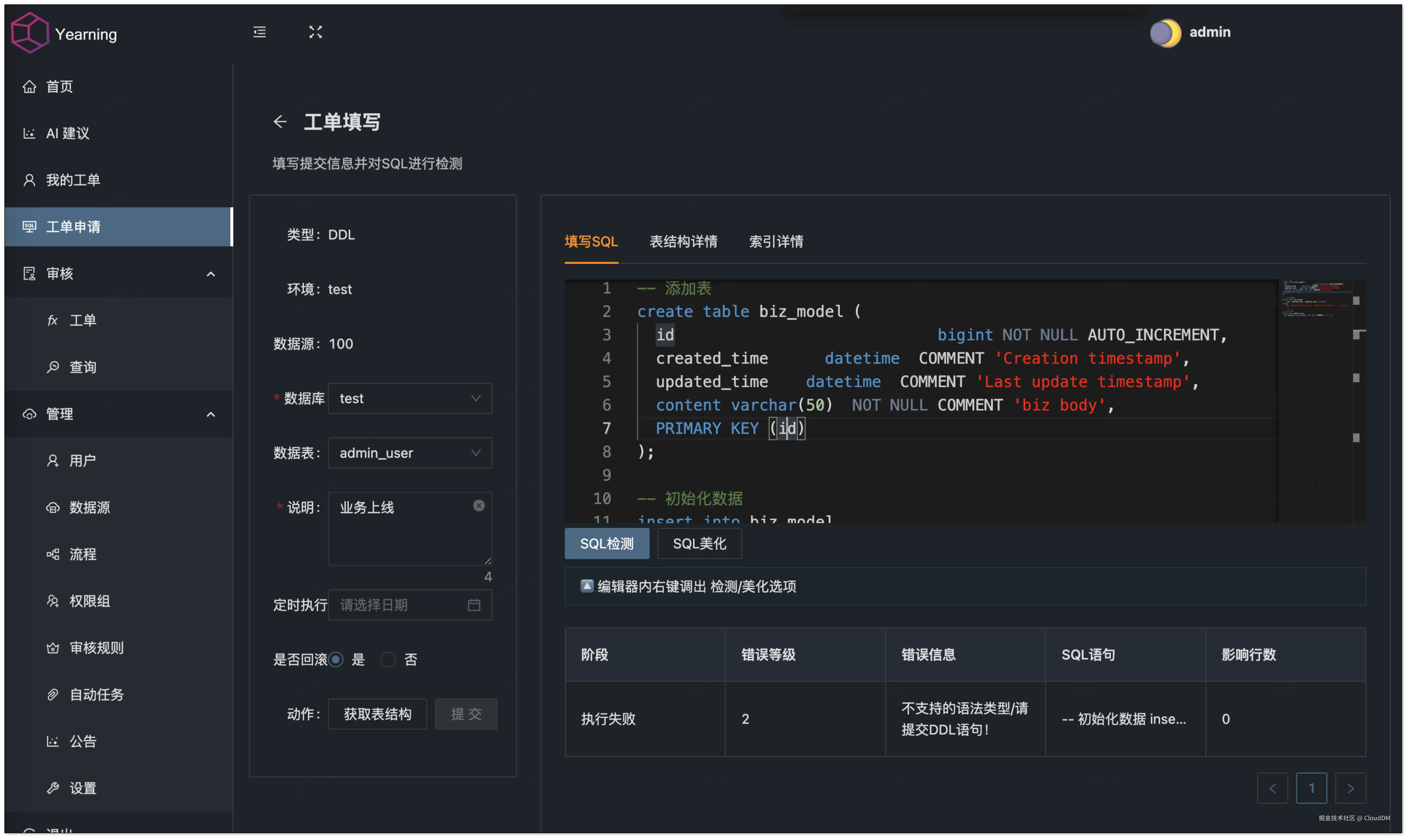 启用 SQL 规则校验后,Yearning 在提交工单时会对 SQL 进行检查,只有通过审核的 SQL 才能提交。