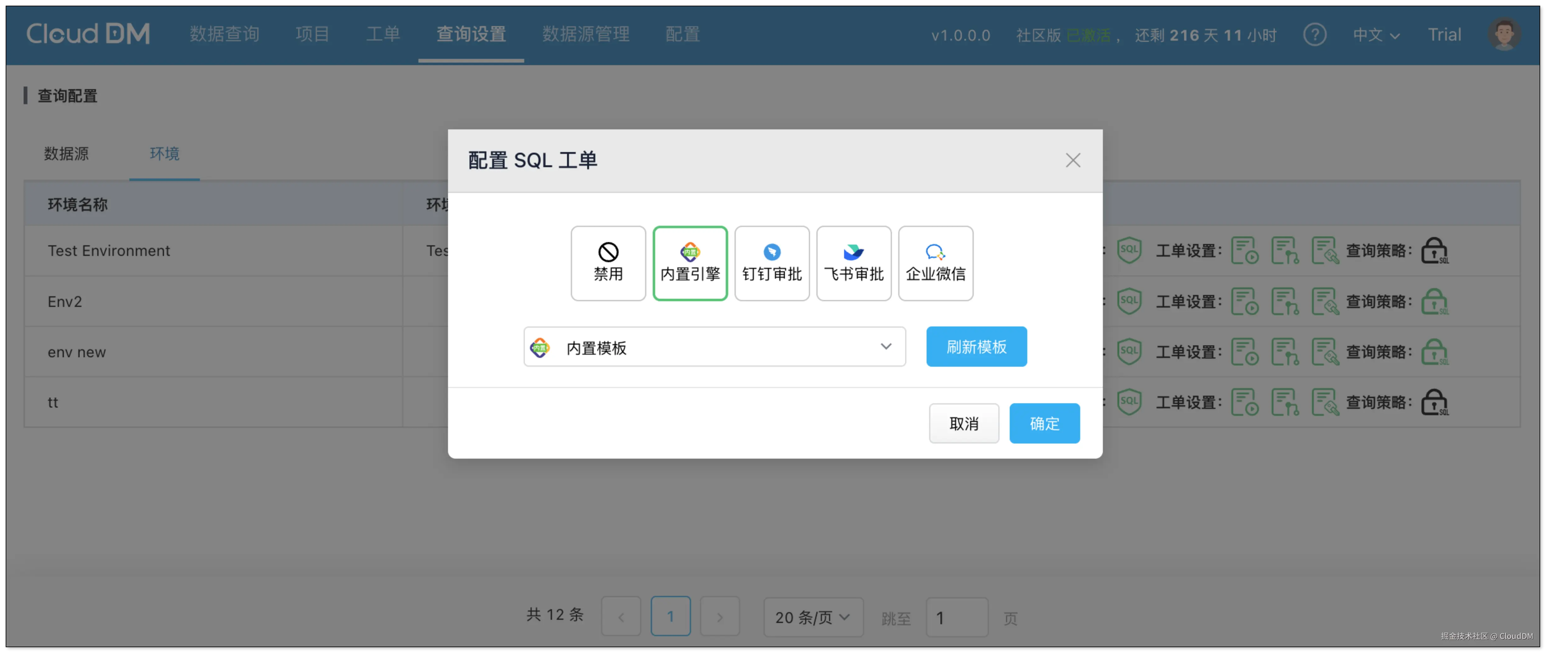 CloudDM 有一个内置简易审批程序,可以提供审批的基本功能,也可以对接 钉钉、飞书、企业微信作为外部审批流程引擎,完成复杂的审批流程。