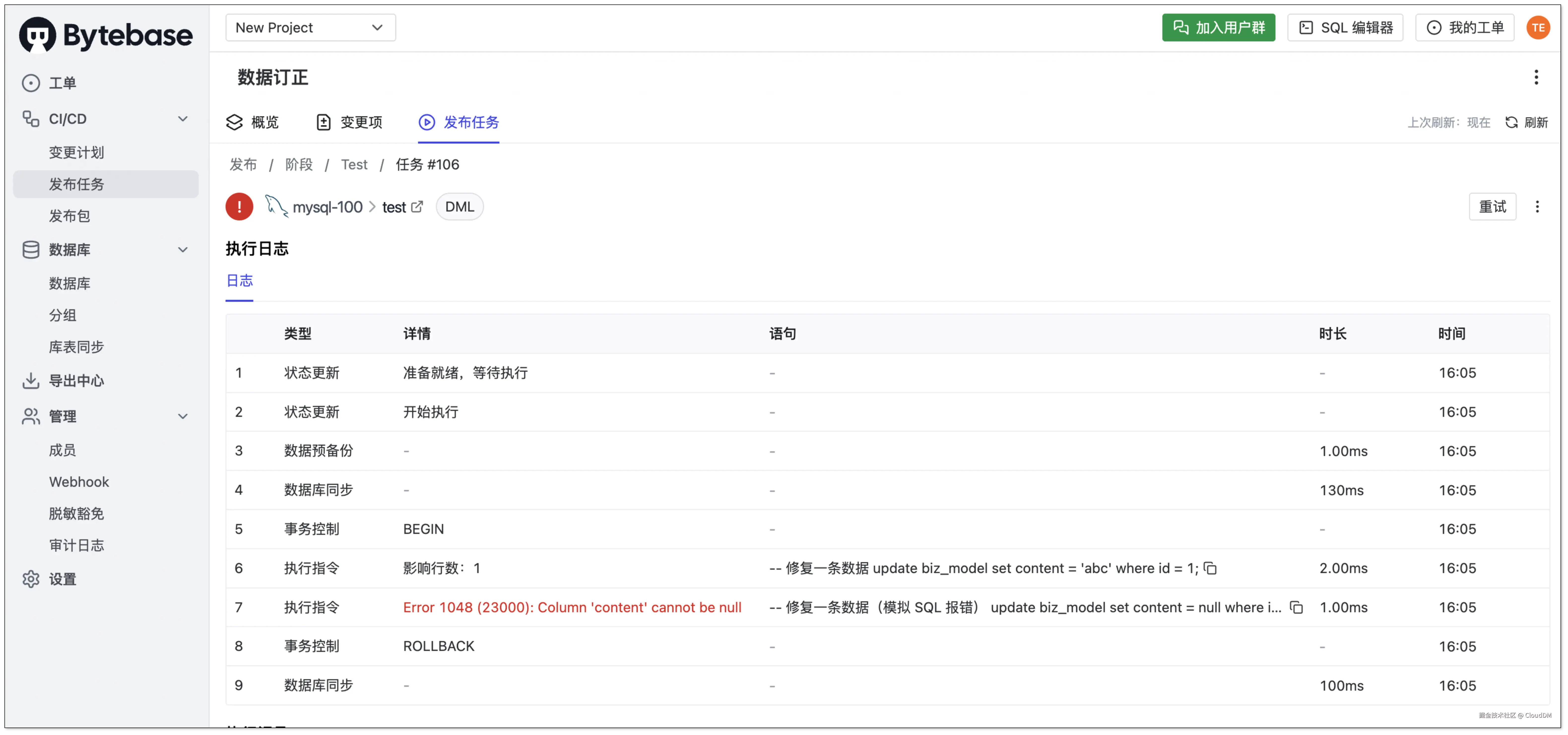 Bytebase 不支持工单调试,并默认以事务方式执行。这意味着在我们设计的 “数据订正” 场景中,报错出现后,需要手动将原始工单进行拆分处理。
