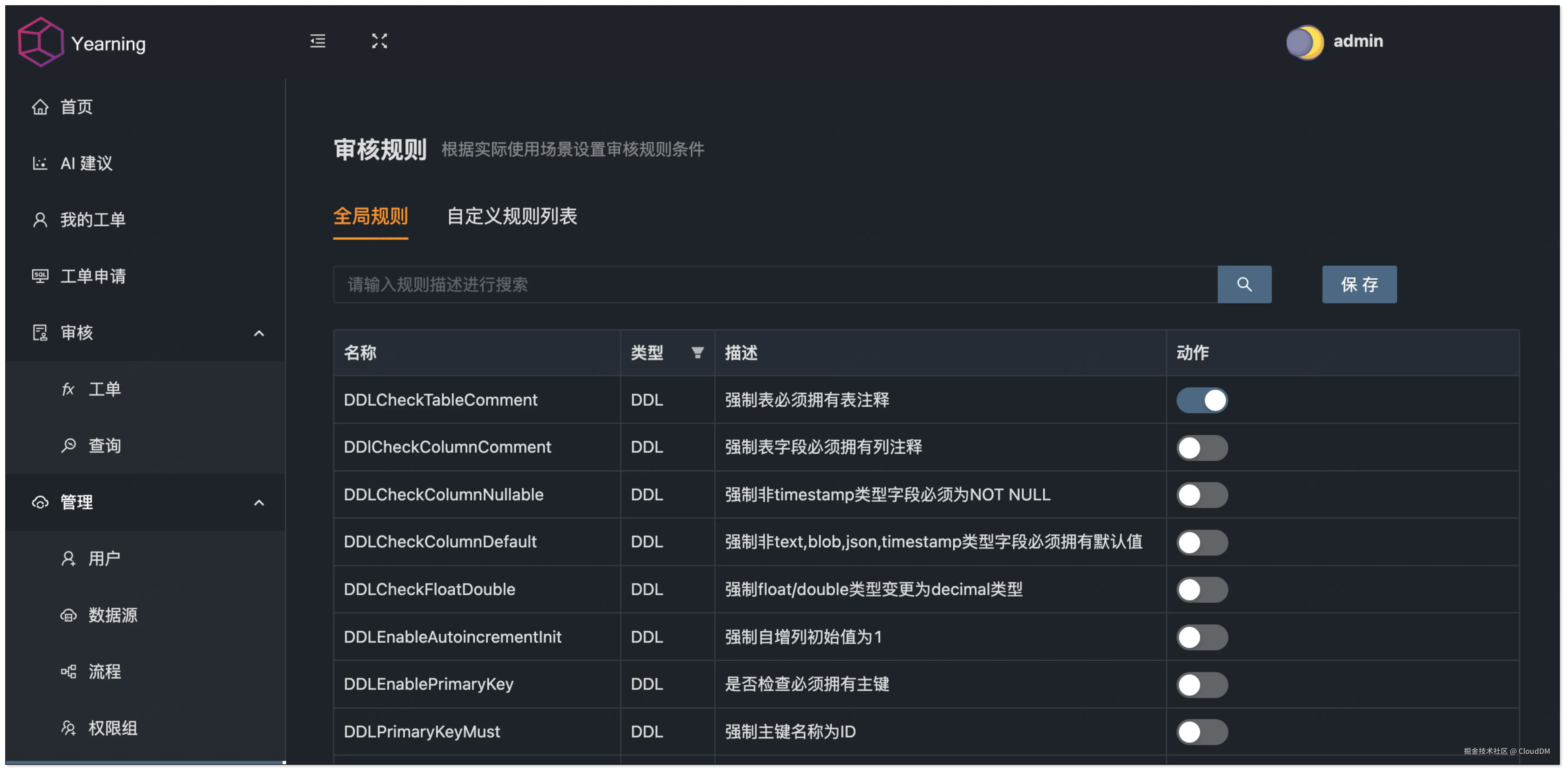 Yearning 内置 46 条审核规则,其中大部分针对 DDL。目前不支持自定义规则。你可以通过创建 SQL 规范或在全局模式中启用已有规则。