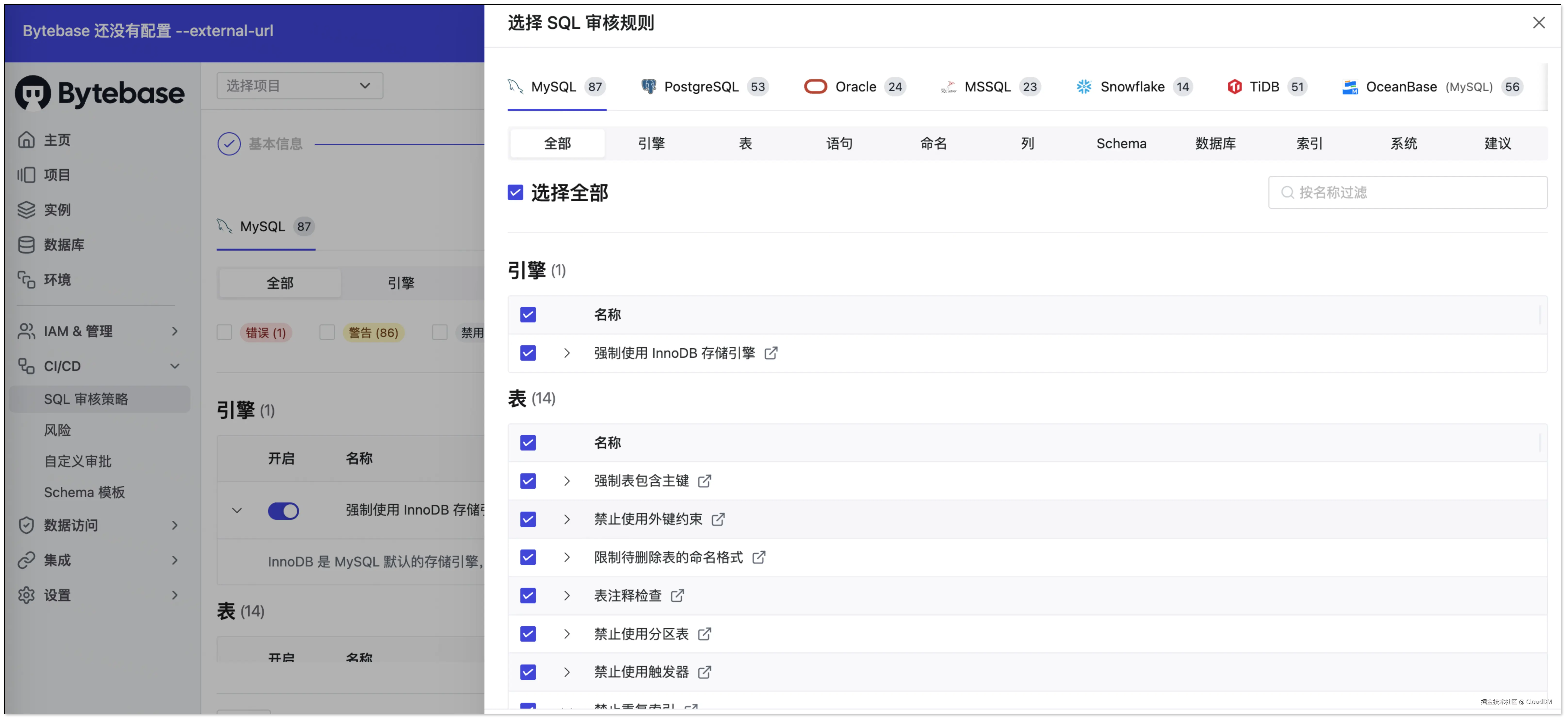 Bytebase 内置了 111 条审核规则,其中部分可以在不同数据源之间共用,用户可以在 7 种数据源下配置它们。