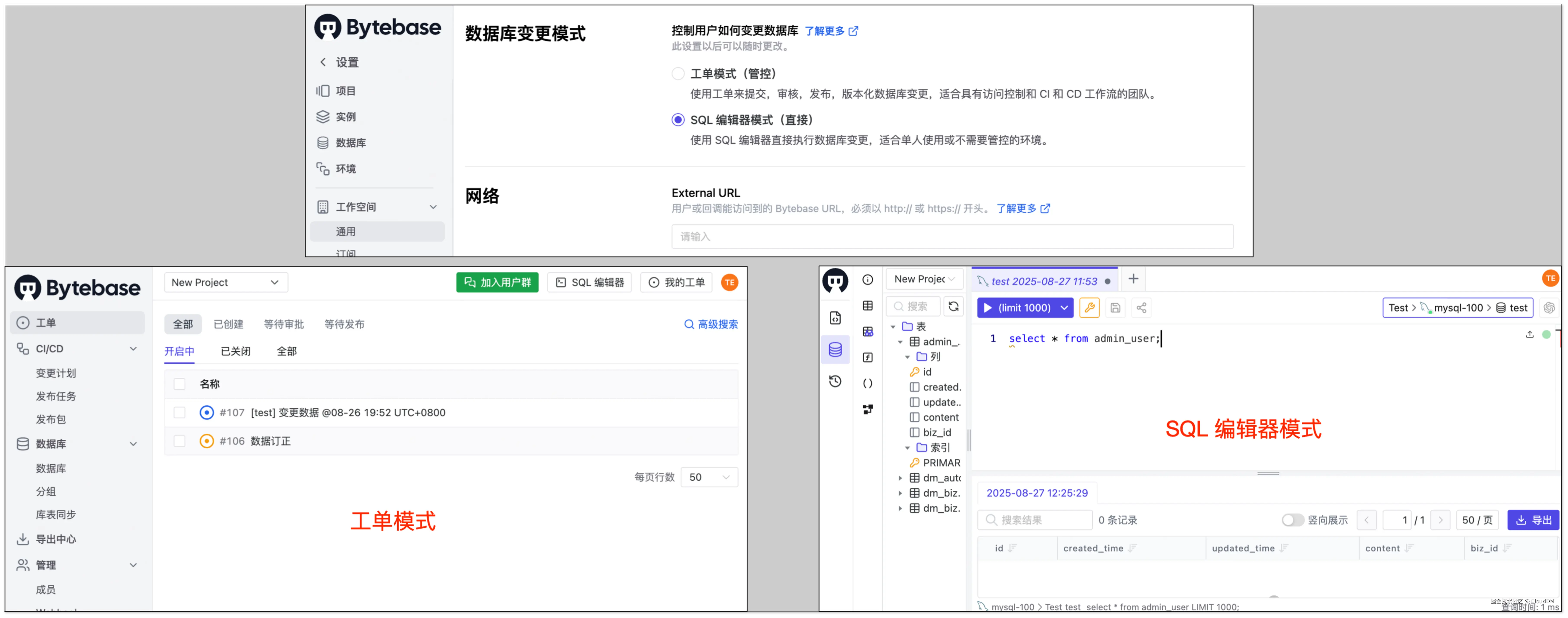 - 查询控制台:在查询控制台简单体验中,CloudDM、Bytebase 用户体验较为友好,可以很好适配开发环境和生产环境的实际需求。